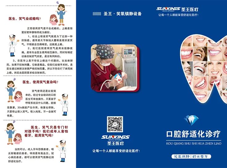 首先要向大家科普,因為對這種舒適化笑氣的應用很多患者還存在顧慮,所以圣王也是配合門診出了《口腔舒適化診療》的冊子,它里面有很多,比如說孩子看牙不配合、不想全麻怎么辦;吸入之后會不會成癮、有什么危害等問題解答,我覺得作為我們臨床醫生來講,可以用這個冊子給患者做科普。讓患者對舒適化笑氣鎮靜的風險、顧慮打消,這樣他才能配合你做臨床的醫療。