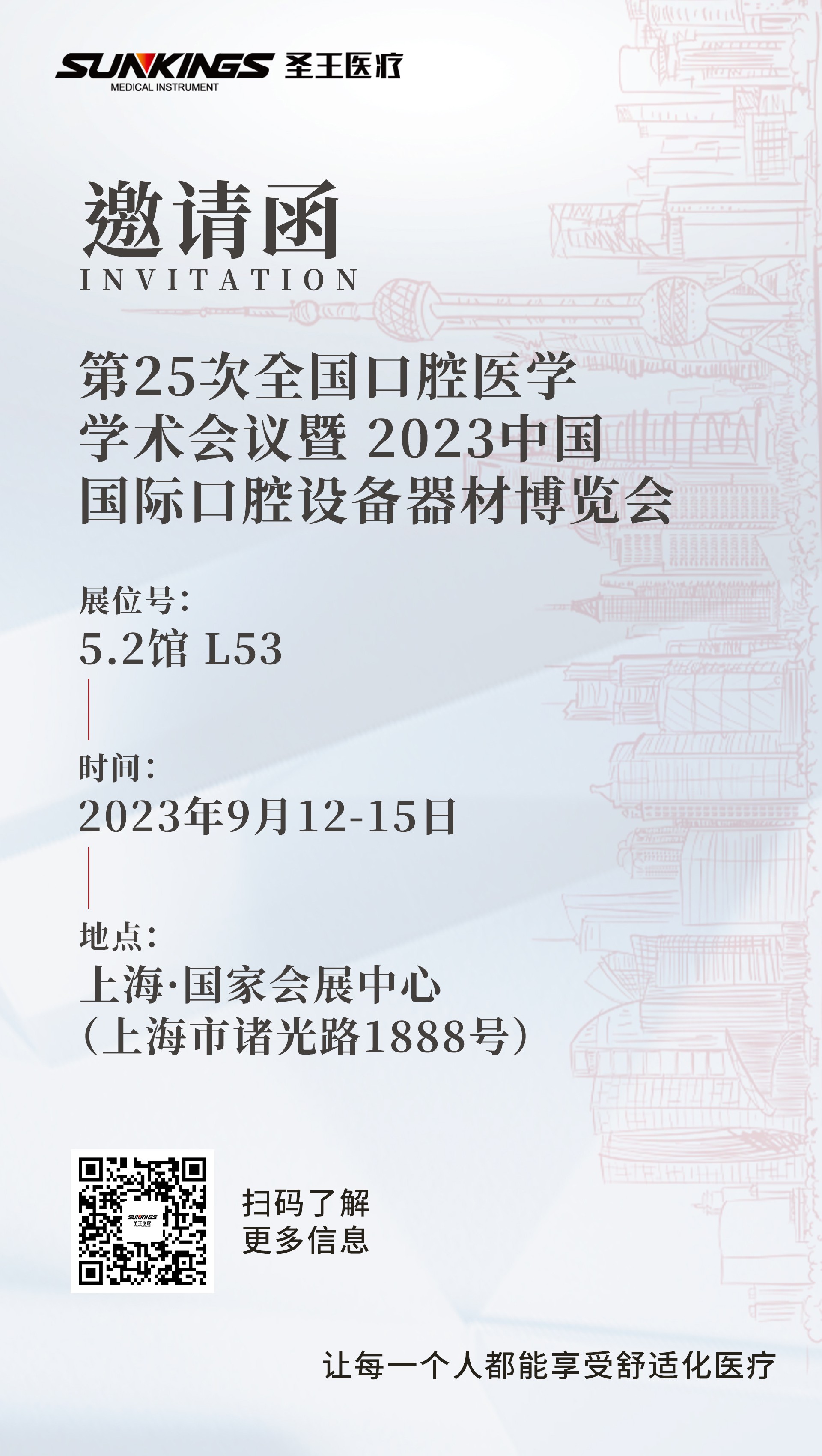 圣王醫療將于9月12至15日,在上海·國家會議中心參展第25次全國口腔醫學學術會議暨2023中國國際口腔設備器材博覽會,展位號:5.2館 L53,在此誠摯地邀請全國各界的伙伴們,蒞臨現場。