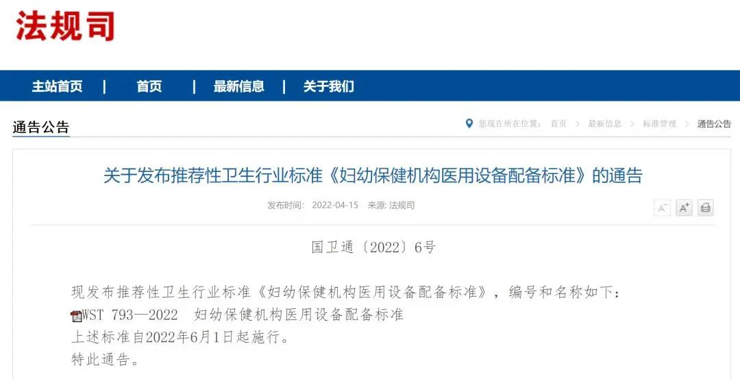 2022年4月15日,國家衛健委發布關于推薦性衛生行業標準《婦幼保健機構醫用設備配備標準》的通告。