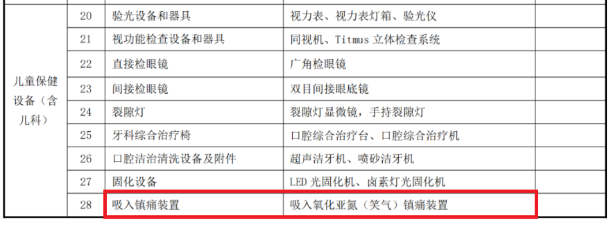 其中,編號28號設備為吸入笑氣鎮痛裝置,成為兒童保健設備(含兒科)的標配。